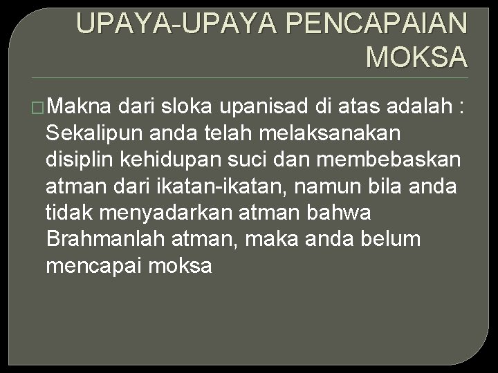Jadi moksa adalah suatu kelepasan atau kebebasan. Kata atman, diambil dari kata an (bernafas), yaitu nafas kehidupan (wayan maswinara 1996 :75). dengan menyadari energi hidup inilah kita akan terhubung dengan sumber energi yang kita sebut sebagai atman atau roh kudus. atman di dalam badan manusia disebut: Samsara • lingkaran kelahiran dan kematian yang dilalui oleh atman. Moksa atau mukti atau nirwana berarti kebebasan, kemerdekaan atau terlepas dari ikatan karma. dengan kekuatan brahman, jiwa dimurnikan. Moksa adalah tujuan terakhir dari seluruh umat hindu. Sistem yang dikembangkan oleh ramanuja. Dimana kata moksa dpt disamakan dengan nirwana, nisreyasa atau keparamarthan. Dan brahman dapat disamakan dengan sistem lsafat v ishishtadvaita v edanta. Melalui meditasi, para praktisi dapat bergabung dengan atau memahami hubungan seseorang dengan brahman. hubungan atman dengan badan ini ibarat bola lampu dengan listrik.