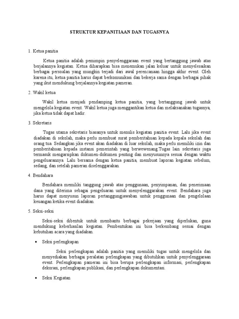 Tugas Ketua Panitia Pameran - Divisi Divisi Dalam Acara Kepanitiaan Beserta Jobdeksnya : Pimpinan organisasi adalah seorang ketua yang memiliki tugas memimpin organisasi tersebut.. Penyelenggaraan pameran seni rupa sekolah akan berjalan. Tugas pokok sekretaris dalam suatu kegiatan pameran atau suatu . Secara singkat, berikut ini pembagian tugas. Mengordinasi kerja seluruh panitia kerja termasuk . Bertanggung jawab atas keberhasilan pameran.